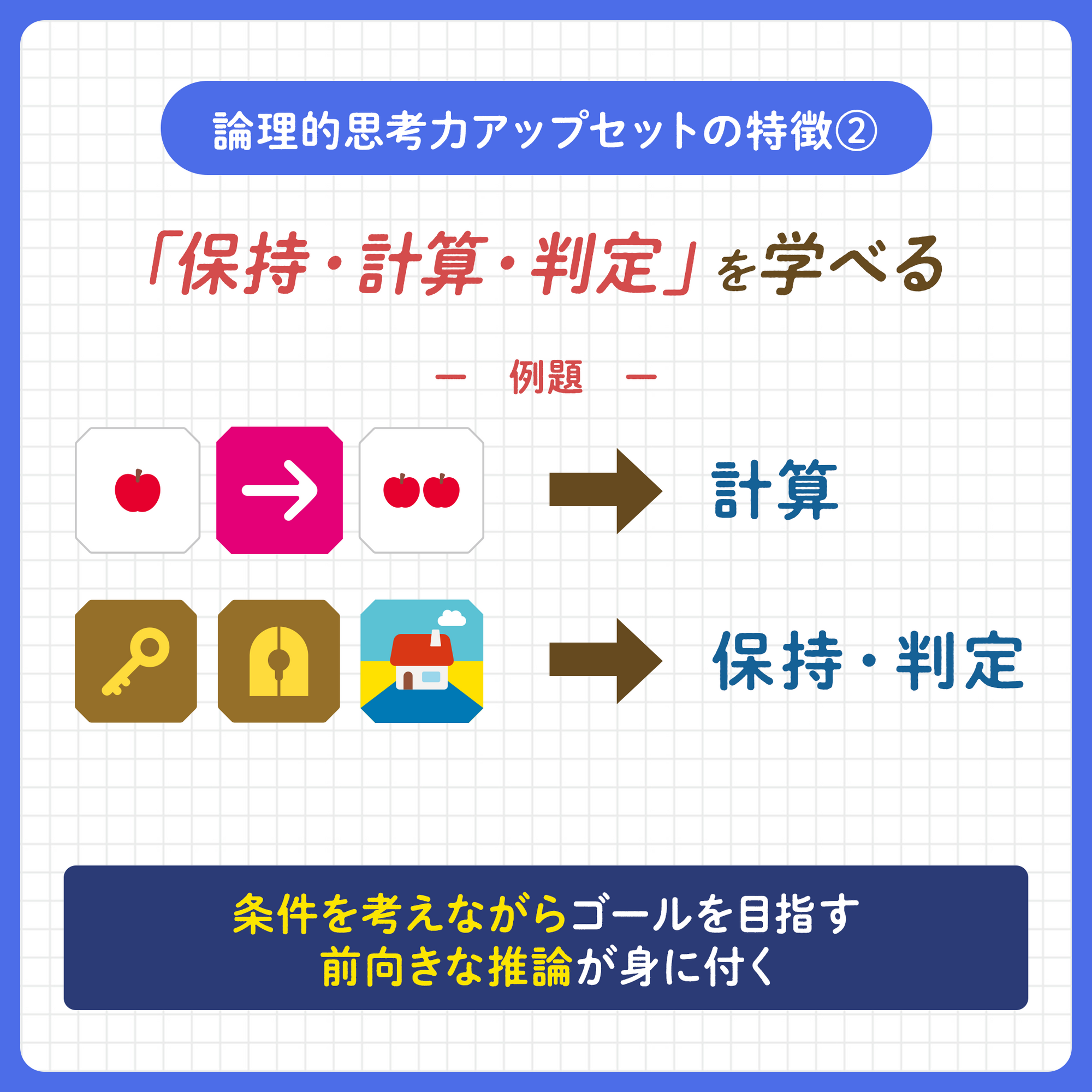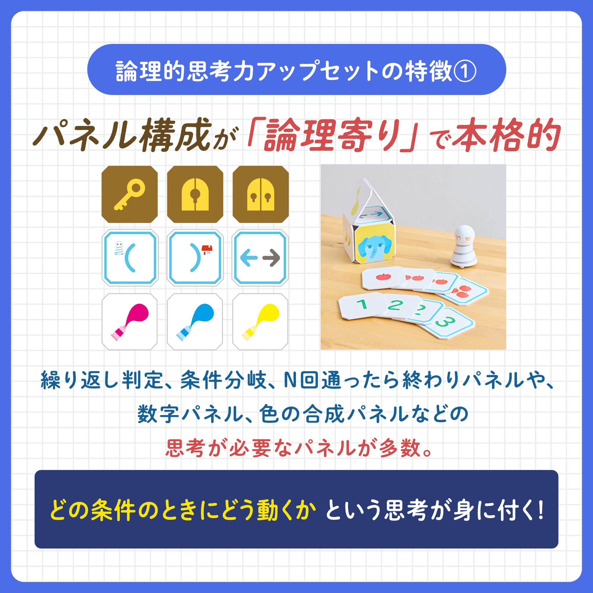 コマンドパネルを使ってかわいいロボットをゴールに導き、パネルに表現されたプログラミングの概念に親しんでもらうことで、遊びながら未来の世代に必要なプログラミング教育を実現します。