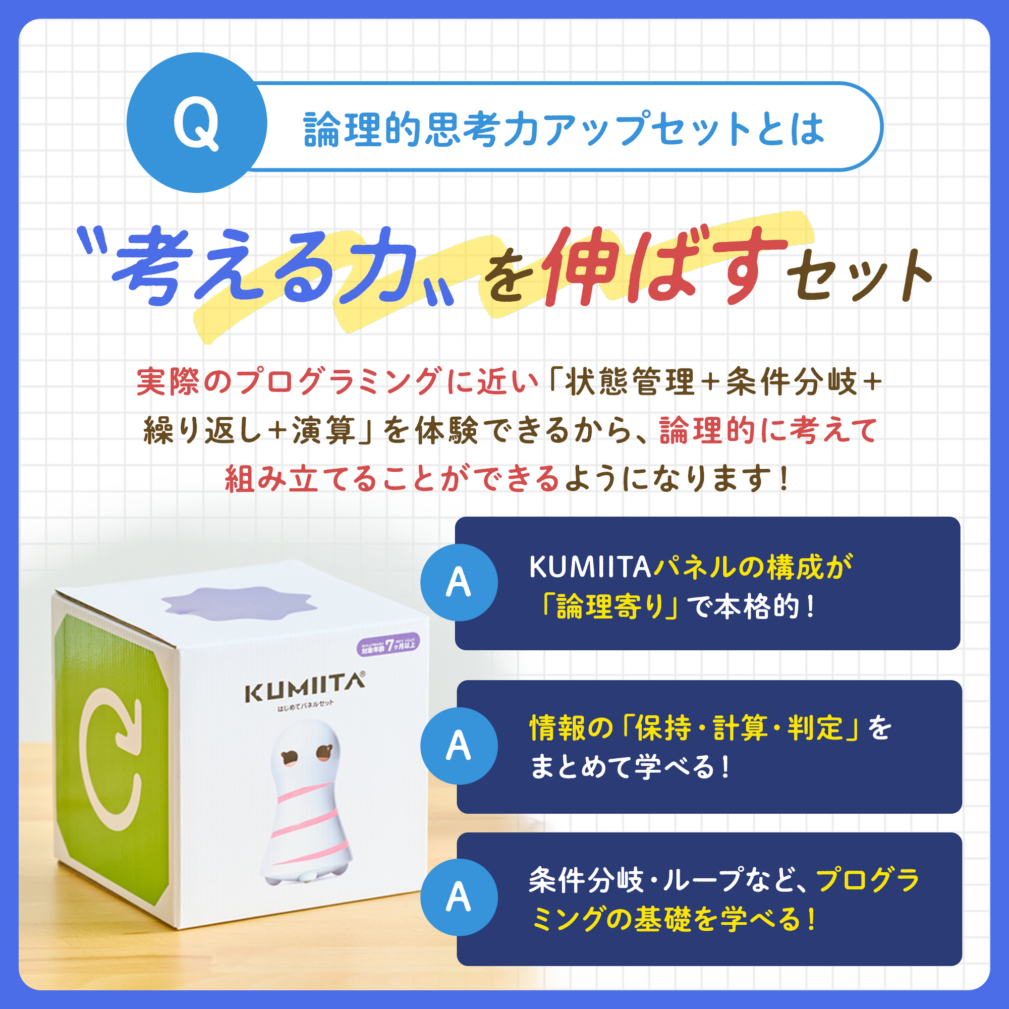 『KUMIITA』は、コンピュータ・プログラミングの基礎を、遊びながら体得できる知育玩具です。